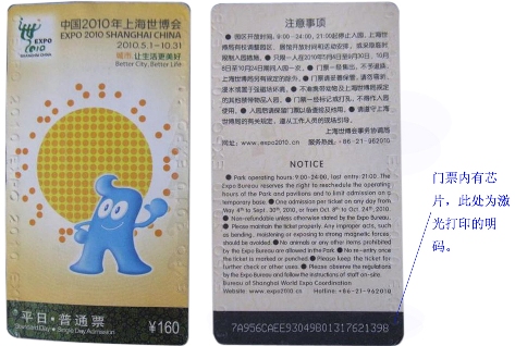 作为2010年上海世博的第一张名片,世博门票在设计防伪方面均达到了国际领先水准。如果说世博是对未来世界的一次展望,那么这张小小的世博门票则是当前全球标识前沿科技的缩影。