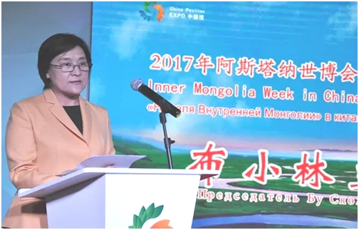 8月22日,2017年阿斯塔纳世博会内蒙古活动周在哈萨克斯坦首都阿斯塔纳拉开帷幕。中国内蒙古自治区党委副书记、自治区主席布小林、中国国际贸易促进委员会副会长、世博会中国组委会副主任张伟、哈萨克斯坦国会参议院(上院)参议员拉舌德阿克木夫、哈萨克斯坦中国贸易促进协会主席哈那提拜塞克、哈萨克斯坦投资委员会主席拉里萨芝玛嘎丽耶法、哈萨克斯坦卡拉干达州副州长阿合米尔加诺夫出席开幕式并致辞。世博会有关国家馆馆长、哈萨克斯坦有关商协会负责人和代表、中国内蒙古自治区相关部门负责人等160余人参加开幕式。