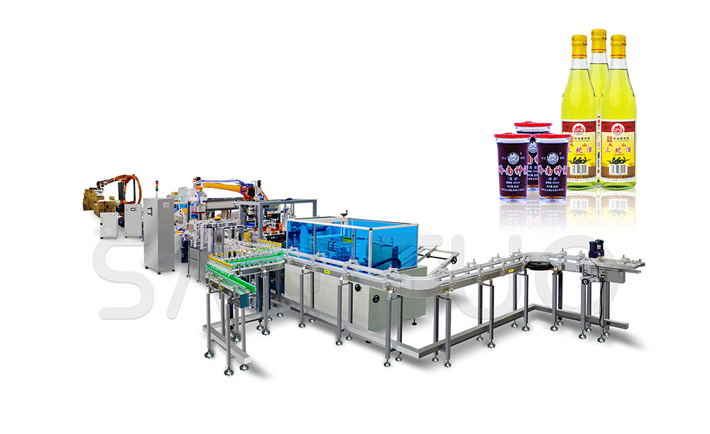 这条酒瓶装箱生产线也是龙山酒业入驻岭南食品工业小镇后的首条投入生产的产线,产品生产效率有效提高了3-5倍。该产线集双重装箱功能于一体,实现自动开箱,自动入底托,机器人装箱,自动入顶托,机器人装大箱,封箱与码垛等功能。最高产量可达8000瓶每小时。