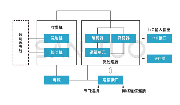 射频识别阅读器是一种读写设备,用于捕获和处理射频识别标签数据。它可以是单独的,也可以嵌入其他系统。阅读器的硬件部分通常由收发器、微处理器、存储器、外部传感器/执行器、报警器输入/输出接口、通信接口和电源组成。