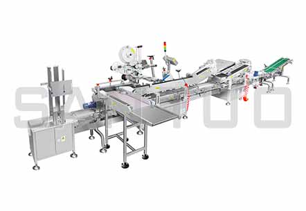 (图示:立转卧式圆瓶贴标、自动分托、入托系统)