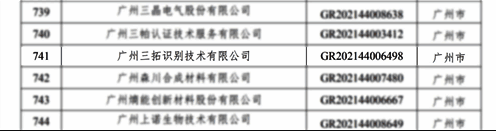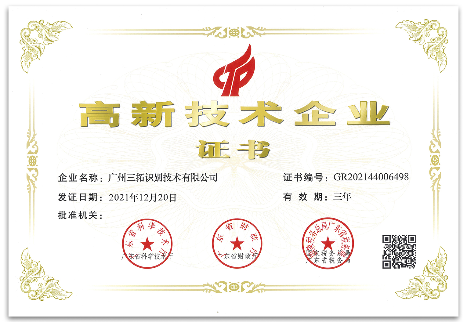 近日,广东省高新技术企业认定管理工作领导小组办公室公布了2021年高新技术企业获奖名单,广州三拓识别技术有限公司再次获得“高新技术企业”认定。这是自2015年来,我司第三次荣获“高新技术企业”认定证书,这也标志着广州三拓在贴标、视觉检测、智能包装生产线的创新能力得到了国家层面的充分认可与支持。